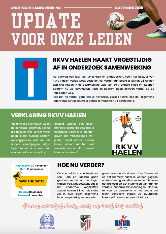 De stuurgroep heeft de derde editie van de nieuwsbrief over het onderzoek naar samenwerking tussen voetbalverenigingen in Leudal gepubliceerd. In deze uitgave lees je de laatste stand van zaken, waaronder het besluit van RKVV Haelen om het traject te verlaten en een vooruitblik op het vervolg.